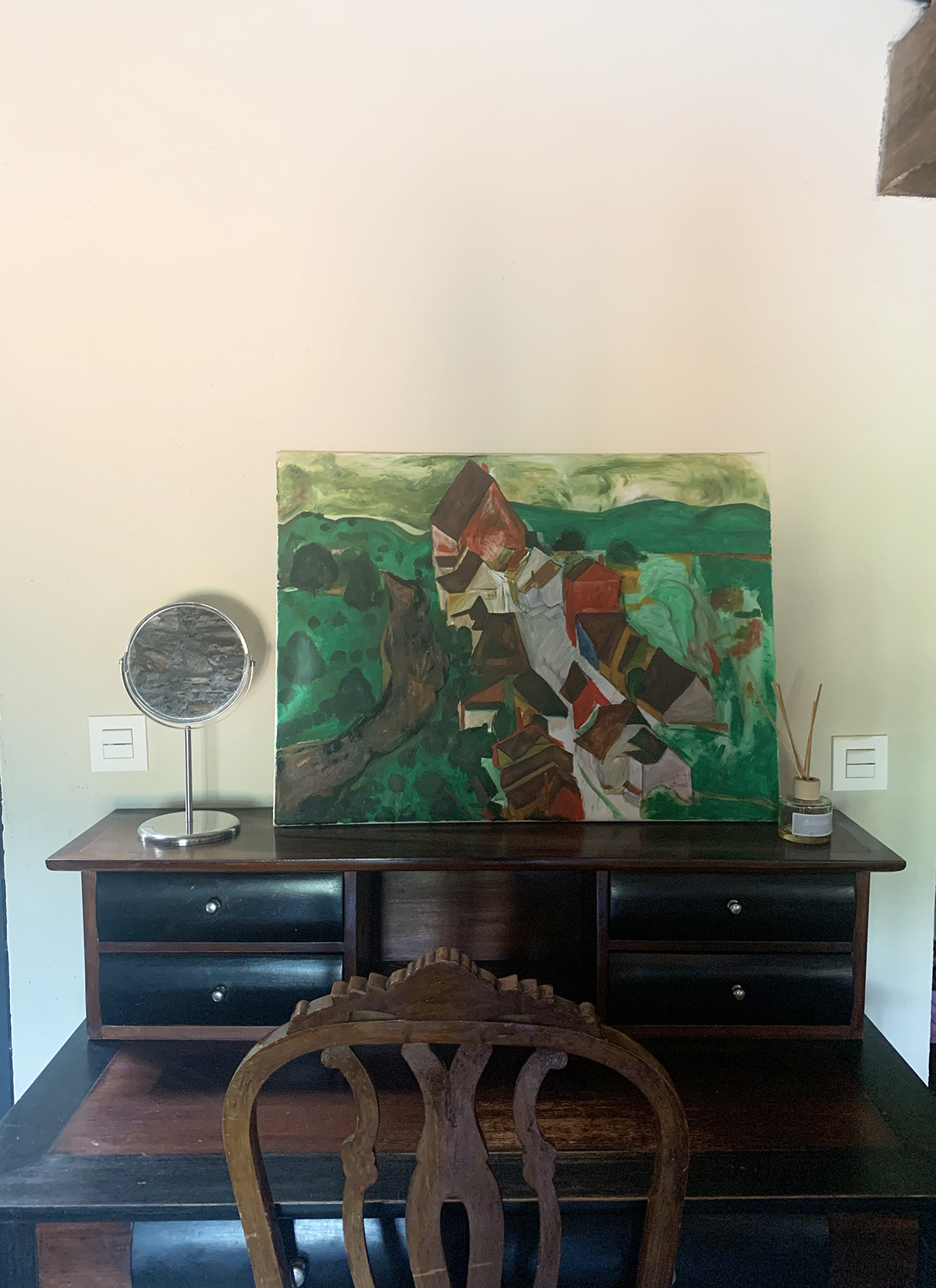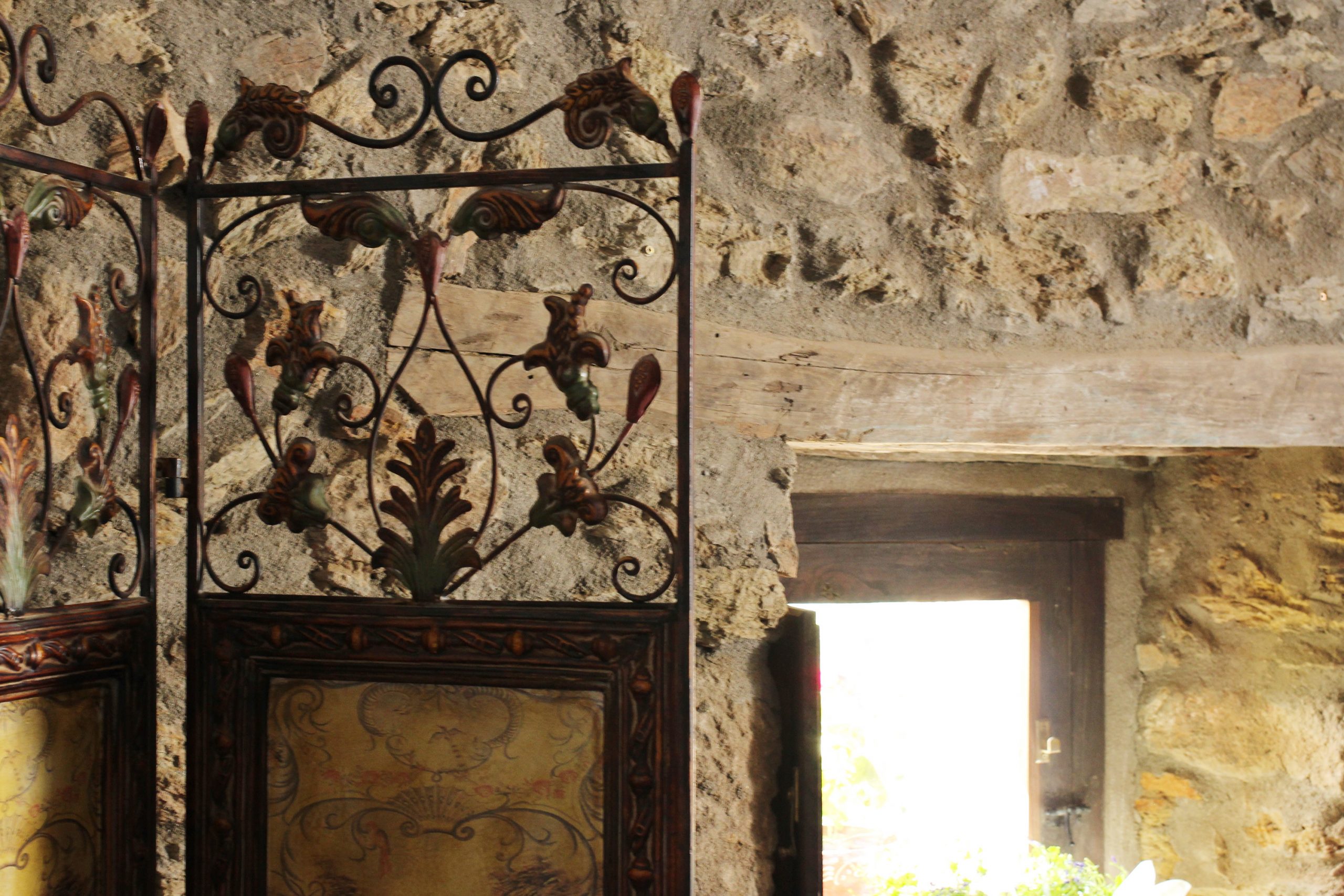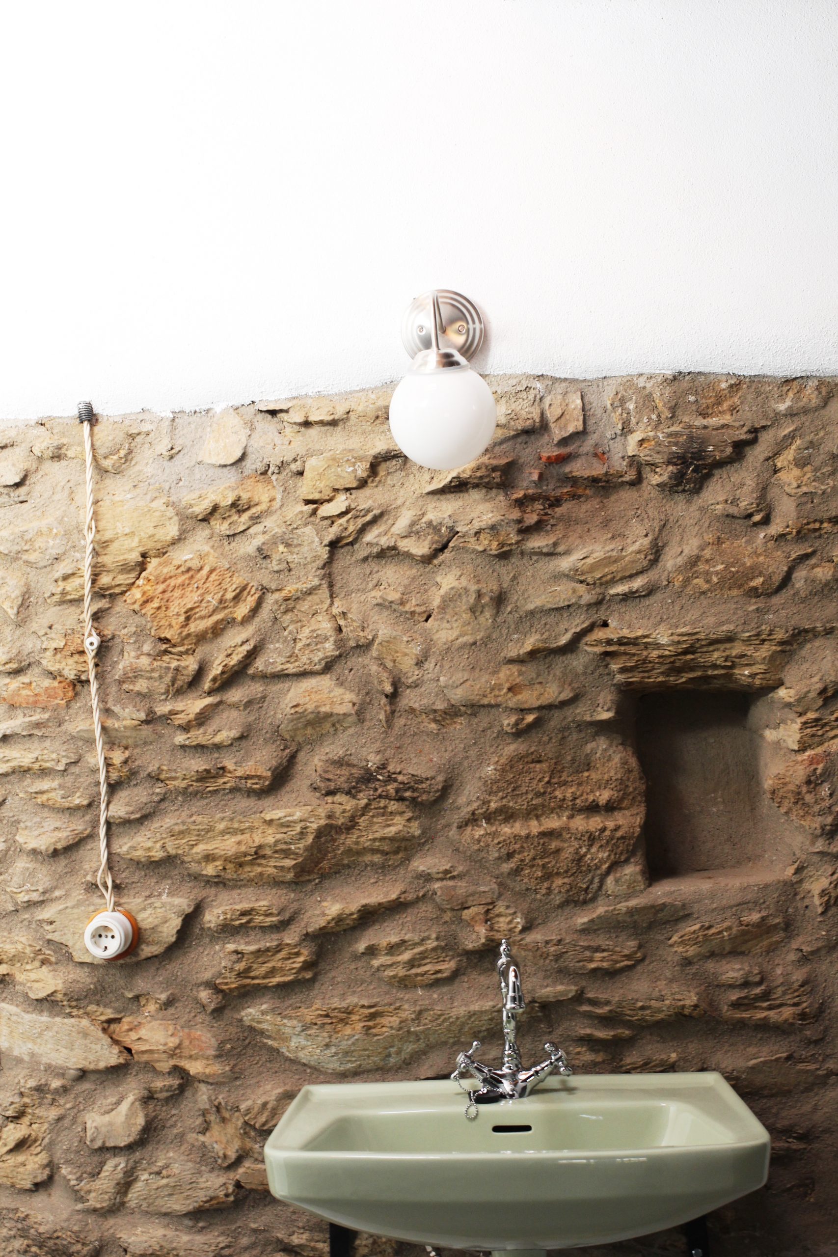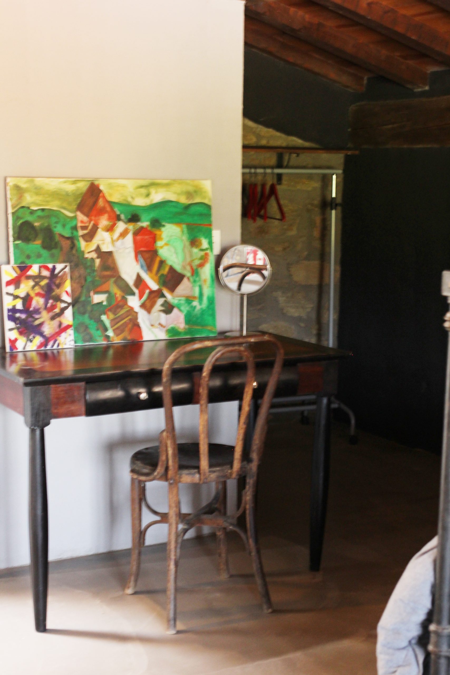 En la planta de arriba una habitación con techo abuhardillado y ventanas de madera. La cama de hierro es una herencia de mi abuela, cálida y mullida, con mesillas de madera y un escritorio maravillo. El cuarto de ducha es espacioso y tiene una claraboya que le permite tener luz natural durante todo el día. El lavabo verde es de un anticuario y los azulejos de la ducha salen en la película “El cuento de la criada”, son preciosos. Pintada en colores grises, blancos, madera teñidas de blanco y nogal y paredes en piedra. Con acceso directo por el patio, el cual es compartido, donde hay unas tumbonas para tomar el sol y poder leer un buen libro, una mesa con sillas para disfrutar de la comida o desayuno. La mitad está tapado con un porche en el cual te puedes proteger mientras llueve o calienta el sol.
